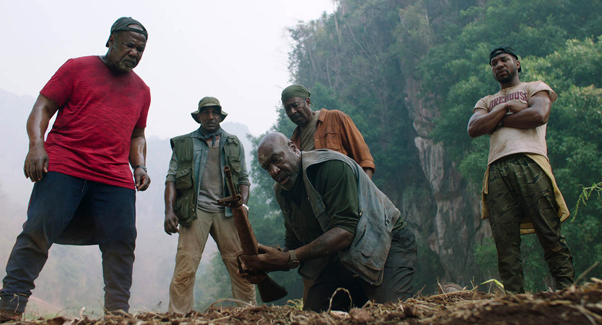 Актерский состав не шибко звездный. Основной исполнитель – Делрой Линдо, которого можно было часто видеть в фильмах девяностых и начала нулевых. Есть два мужика из сериала «Прослушка» (я ждал знаменитого протяжного «sheeeeet» и... дождался). Есть Чедвик «Черная пантера» Боузман. У Линдо самый ПТСР-ный персонаж с монологом в камеру (тоже фишка режиссера).